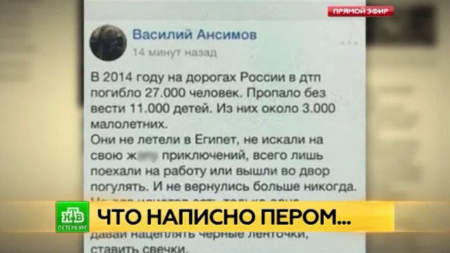 Людей, сочувствующих семьям погибших, Василий Ансимов назвал идиотами. Тут же получил массу сообщений от возмущенных коллег и друзей и, следуя подсказкам, сначала отредактировал свое изречение, подобрав более мягкие слова, а к вечеру того же дня удалил пост.