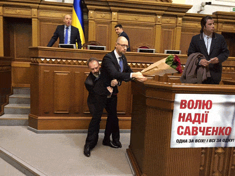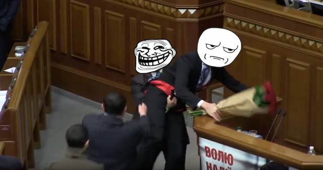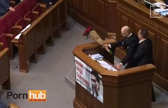 Премьер-министр Яценюк зачитывал отчет за год, когда к нему внезапно подошел депутат от Блока Петра Порошенко Олег Барна и вручил ему большой букет роз. Впрочем, на этом романтика немедленно закончилась и настало время для, так сказать, физического контакта. Не успел Яценюк вдохнуть аромат цветов, как Барна решительным жестом схватил премьер-министра за грудь и за причинное место и попытался унести его с трибуны. Яценюк при этом не очень-то и сопротивлялся.