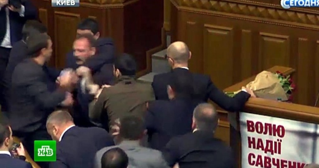 Драка в Верховной раде произошла накануне днем. Депутат от Блока Петра Порошенко Олег Барна вышел к трибуне, где выступал украинский премьер, и подарил ему букет роз с траурной лентой. После чего Барна обхватил Яценюка за грудь и причинное место и попытался на руках унести с трибуны.