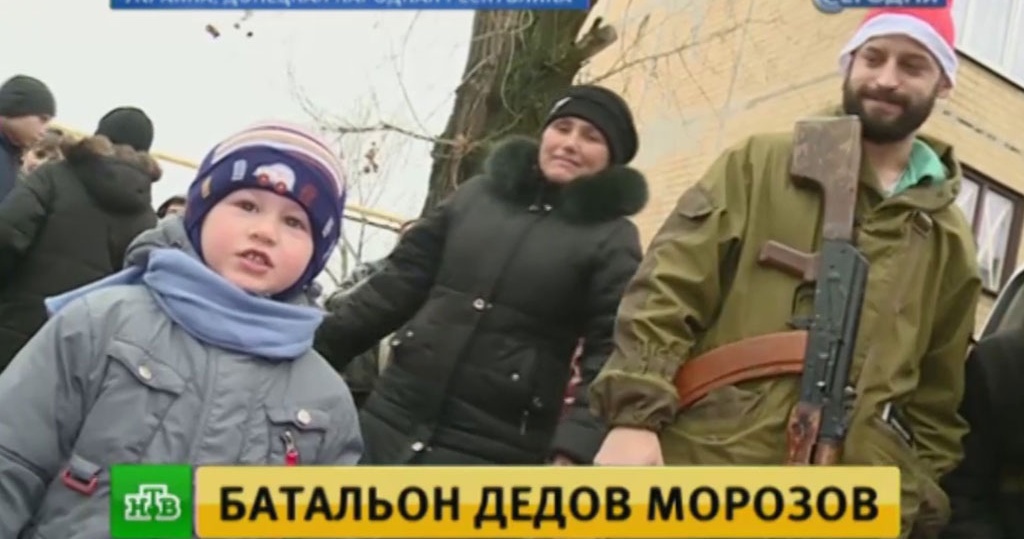 Вместо военных фуражек ополченцы надевают новогодние красные шапки. Взрослым вручают продукты первой необходимости, детям коробки с конфетами. Но по традиции только после того, как малыши расскажут стихотворение.