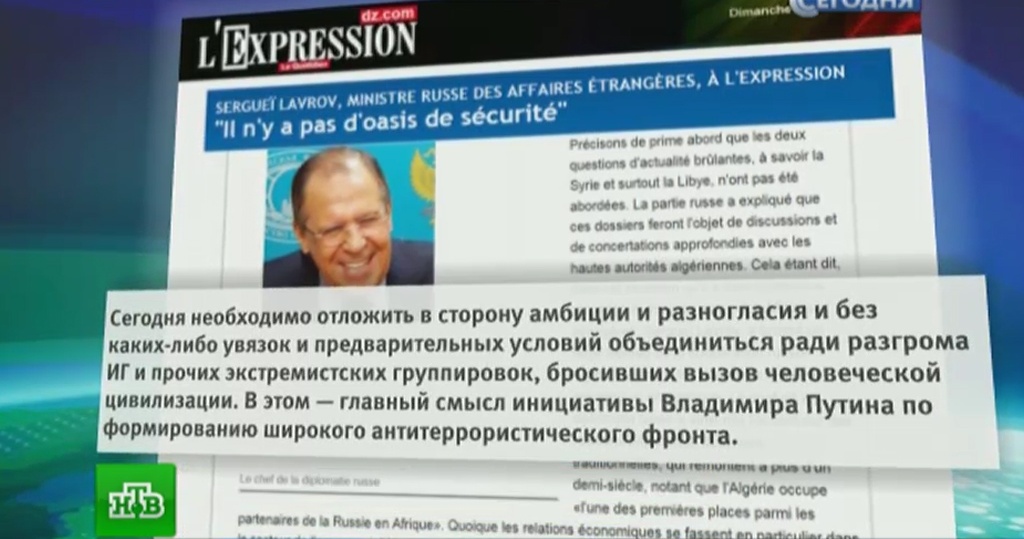 Сергей Лавров, министр иностранных дел РФ: «Сегодня необходимо отложить в сторону амбиции и разногласия, без каких-либо увязок и предварительных условий объединиться ради разгрома ИГИЛ и прочих экстремистских группировок, бросивших вызов человеческой цивилизации. В это главный смысл инициативы Владимира Путина по формированию широкого антитеррористического фронта».