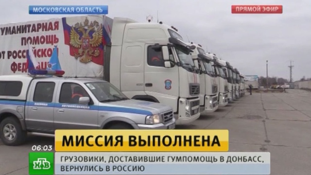 Колонна МЧС, доставившая гуманитарную помощь в Донбасс, вернулась в Подмосковье
