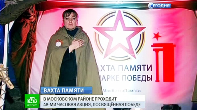 ![]() Акция завершится сегодня, 8 мая, в 10 часов вечера. Как сообщает корреспондент НТВ Мария Сапожникова, для этого в Московском парке Победы установлена палатка, в котором горит Вечный огонь. Участники вахты стоят по двое, молча. Многие проводят этот час с рукой у сердца. Из репродуктора звучат старые и современные песни о войне. И создается такое сильное впечатление, что слезы на глазах появляются не только у участников вахты памяти, но и у простых прохожих. Несмотря на то, что акция публичная, для каждого вахта памяти это очень личное событие. Каждый проводит этот час молча, вспоминая своих близких. К примеру, минувшим вечером вахту памяти несла актриса и депутат Анастасия Мельникова. Она едва сдерживала слезы и пообещала, что в следующем году непременно придет на вахту памяти непременно вместе с дочерью. |