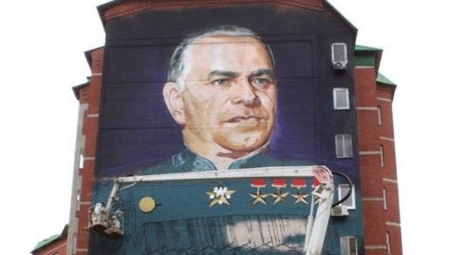 ![]() Рустэм Хамитов: «Уличное искусство должно развиваться, украшать город». На создание гигантского портрета ушло около недели. За основу рисунка была взята самая распространенная фотография маршала Жукова в парадной форме с орденами. Олег Кайбышев, художник: «Сначала были проведены подготовительные работы нанесена грунтовка, а затем уже рисовали. Рисунок "простоит" минимум 10 лет». Всего в Уфе в технике граффити расписали около десяти домов, сообщает ТАСС. |