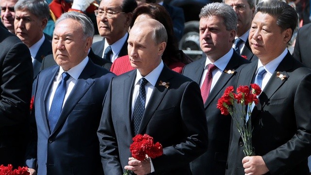 ![]() Шестеро военнослужащих роты Почетного караула возложили цветочную гирлянду из темно-красных роз, перевитую георгиевской лентой, к Могиле Неизвестного солдата. Путин шел в середине процессии, по правую руку от него был президент Казахстана Нурсултан Назарбаев, по левую председатель КНР Си Цзиньпин. После того как гирлянда была уложена у Вечного огня, Путин и зарубежные лидеры возложили к мемориалу букеты гвоздик, преклонив колена. Далее последовала минута молчания. Под звуки маршей военных лет прошла рота Почетного караула, после чего мировые лидеры отправились в Александровский сад для совместного фотографирования. |