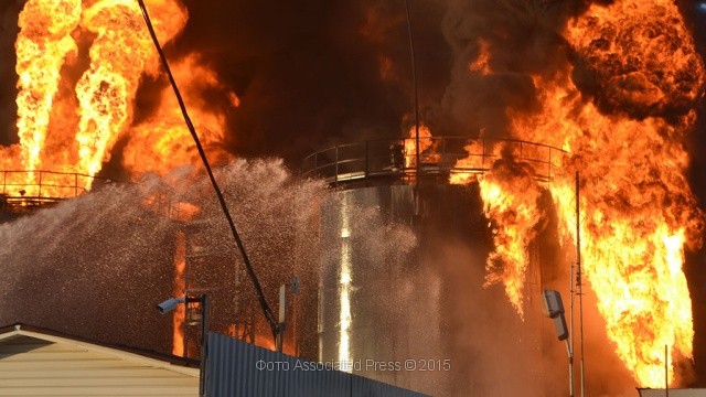 Огнем охвачен большой резервуар с маслом и два полуразрушенных резервуара с нефтепродуктами, сообщили в эфире украинского ТВ последние новости из Васильковского района.