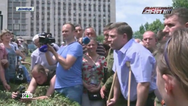 ![]() На площадь перед администрацией пришли полтысячи человек. Глава ДНР Захарченко, несмотря на обострение старой раны, вышел к людям на костылях. |