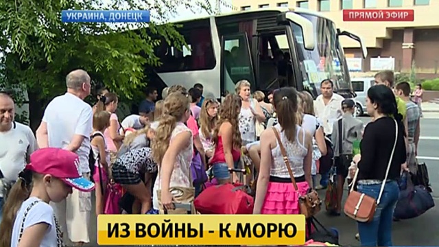 Редко когда в предрассветный час на улицах Донецка услышишь детские голоса, а тут в унисон звучат несколько сотен. Ребят из столицы одной республики, в которой не прекращаются боевые действия, провожают в другую на отдых в российский Крым, где спокойно и не свистят над головой снаряды.