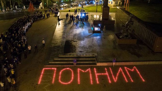 ![]() Зажжение «свечи памяти» состоялось, несмотря на дождь, в 03:00 по местному времени. Из зажженных свеч горожане выложили слово «Помним!». Также люди возложили цветы к Вечному огню. |