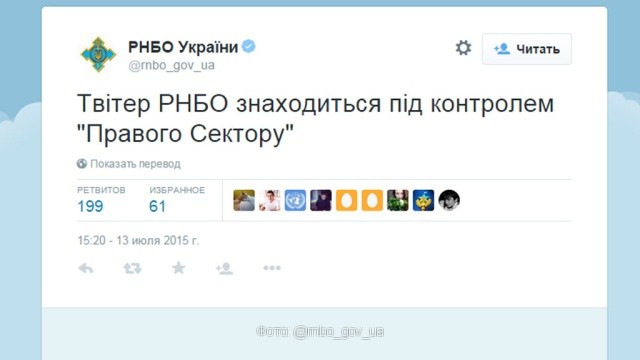 Сегодня днем в этом микроблоге появилось сообщение: «Twitter СНБО находится под контролем "Правого сектора"».