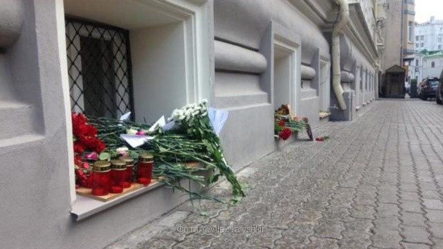Москвичи несут цветы к посольству Нидерландов в годовщину катастрофы под Донецком