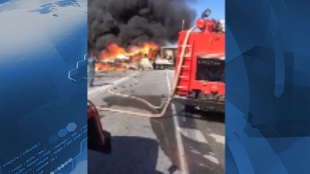 На кадрах с места ДТП виден сильный пожар горит фура, столкнувшаяся с автобусом. Камера сняла и разбитый автобус. На месте работают спасатели, видны пострадавшие.