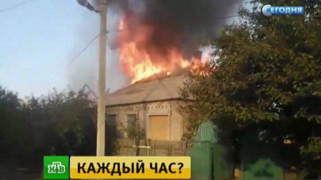 Сразу после оглушительного разрыва снарядов жители поселка Октябрьский выбежали на улицу. Кто-то включил камеру мобильного телефона. Как оказалось, четыре мины попали прямо в дома, которые моментально загорелись.