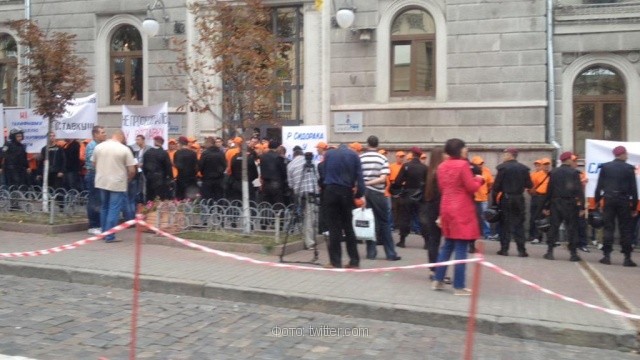 ![]() Протестующие в оранжевых футболках работники предприятия «Укртатнафта» держат плакаты с надписями «Верните наши деньги». |