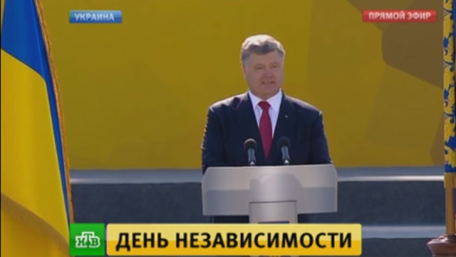 ![]() Украина сегодня отмечает День независимости. По случаю 24-й годовщины в центре Киева украинские военные прошли маршем. Верховный главнокомандующий Пётр Порошенко поблагодарил их за службу и сообщил, что этот год страна должна пройти «как по хрупкому льду». С одной стороны, экономический кризис, с другой ситуация на юго-востоке. Говоря о Донбассе, Порошенко заявил, что не видит альтернативы минским соглашениям, упомянул о мире и тут же перешел к военной тематике.
