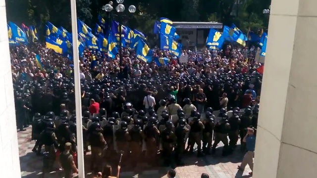 Ранее сегодня в Киеве началась очередная акция протеста. Около 3 тысяч человек собрались у здания Верховной рады, требуя от депутатов не принимать законопроект об изменениях в конституцию страны. Несмотря на это, народные избранники одобрили документ в первом чтении, после чего демонстранты попытались прорваться в парламент, устроив потасовку с силовиками. Источник