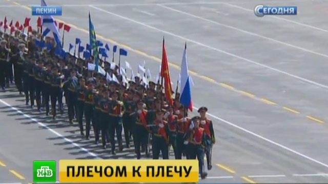 В начале действа парадный строй на лимузине китайского производства объехал председатель КНР Си Цзиньпин. Затем по площади Тяньаньмэнь прошагали 12 тысяч солдат из разных стран, в том числе из России. Военнослужащие 154-го отдельного комендантского Преображенского полка закрывали пешую часть парада.