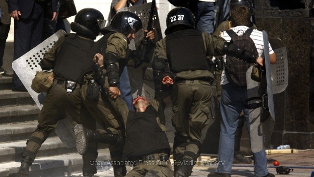 В сотрудников милиции полетели камни, бутылки и дымовые шашки, а в какой-то момент один из демонстрантов бросил в стражей порядка боевую гранату. При взрыве погибли 3 человека, более сотни получили ранения. Источник