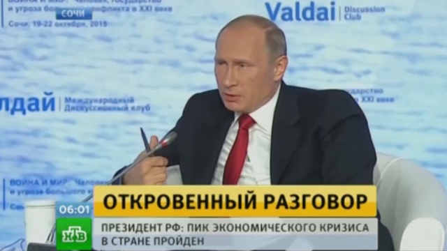 Владимир Путин: «Экономика России испытывает сразу несколько проблем, проходит через несколько проблем и испытаний. Они связаны не только с ограничениями, о которых часто говорят, политизированными ограничениями в сфере экономики, с так называемыми санкциями, они играют определенную роль, но конечно не определяющую. Самым важным фактором ограничения роста и снижения темпов экономического роста, конечно, являются падения цен на традиционные товары нашего экспорта. Но это касается не только России, это касается практически всех развивающихся рынков. И российский рынок тоже страдает. Может быть, даже чуть меньше чем некоторые другие развивающиеся рынки, достаточно посмотреть статистику».